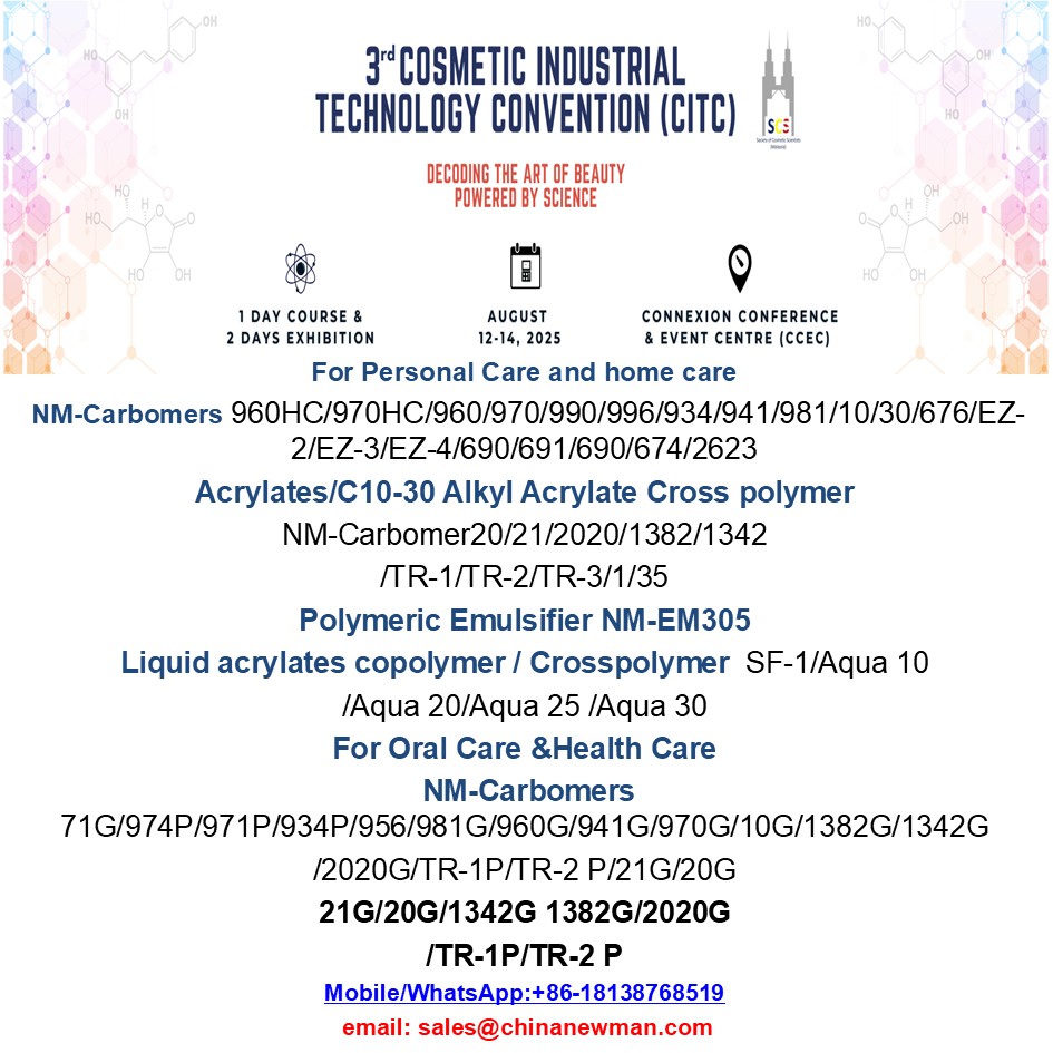 For this CITC exhibition, Anhui Newman has made meticulous preparations and will comprehensively display its rich and diverse product lines. We have been launching and improving our traditional carbomer 960,970C ,996, 990 etc., improve carbomer 20,21,10, and 30. Especially, we launched polymeric emulsifier NM-Carbomer TR series, NM-Carbomer TR-1, TR-2 and TR-3 ,are versatile, non-ethoxylated polymer designed to create stable and mild oil-in-water emulsions at low use levels. Not only thickening ,suspending ability ,but also good emulsifying, and they are great choice for use in many skin care formulations, providing emulsion stability, smooth texture, and a pleasant fresh sensory for emulsions.