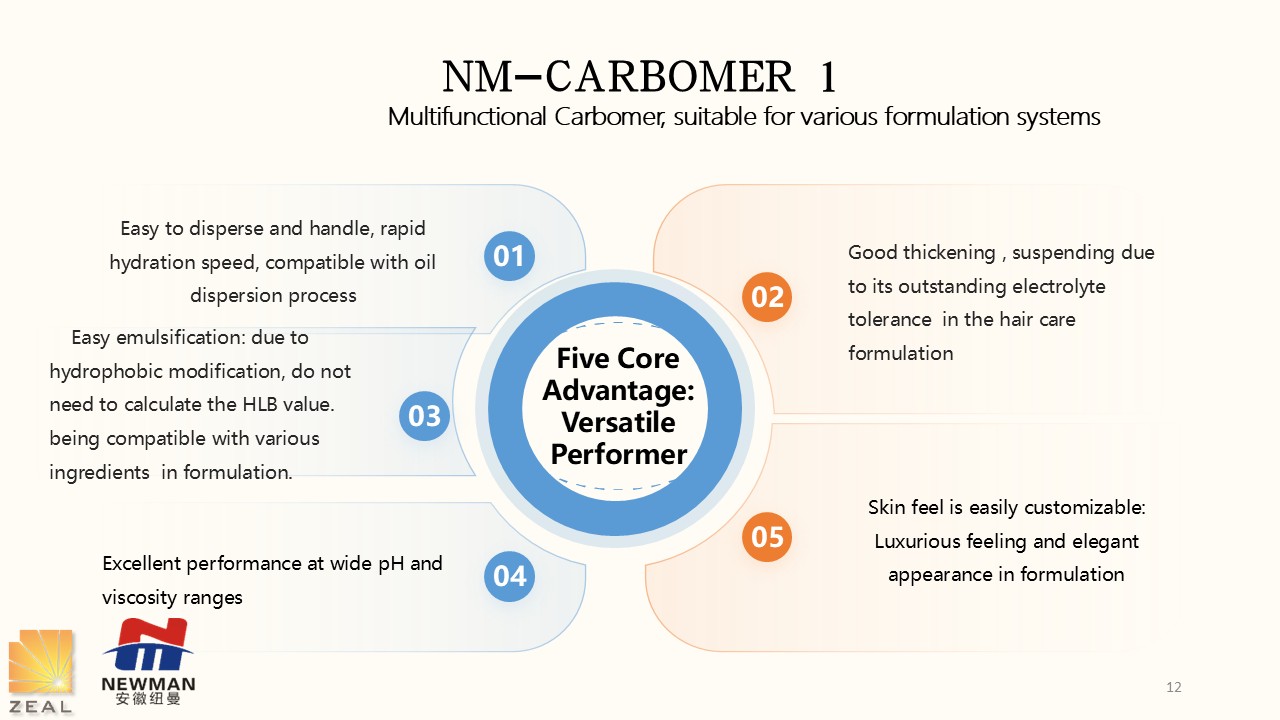 Then, the technical engineer from Zeal company highlighted Newman's new product NM-Carbomer 1, Carbomer 35 that are versatile rheology modifier that integrates thickening, suspending, and emulsifying ability.