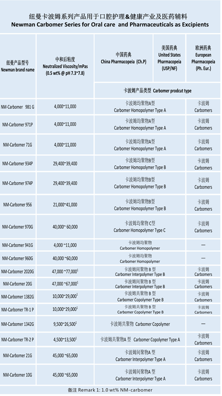 Our heath care and Oral care grade carbomer are focused on, Anhui Newman highlighted the pharmaceutical-grade Carbomer closely related to human health, featuring the following varieties: